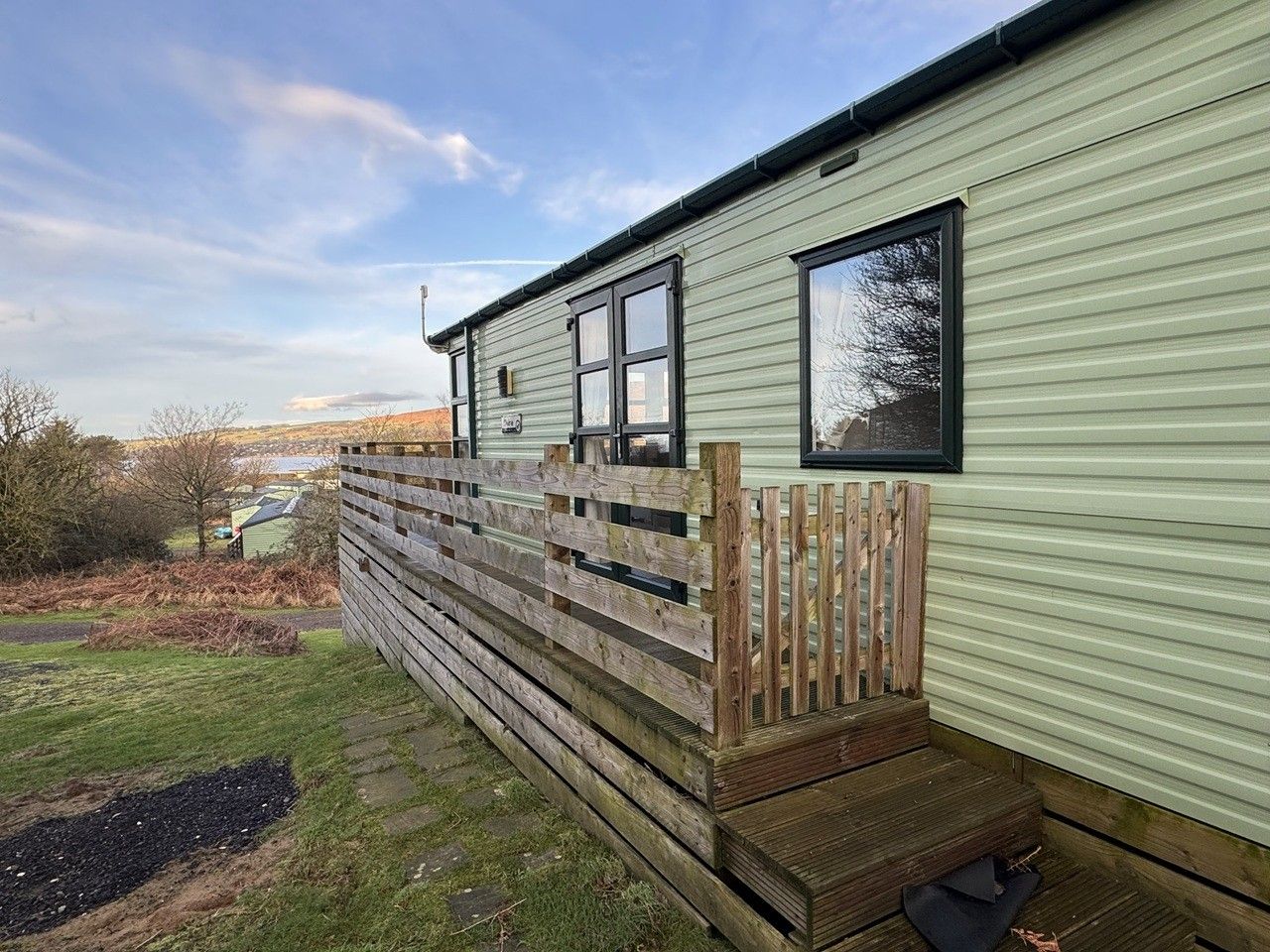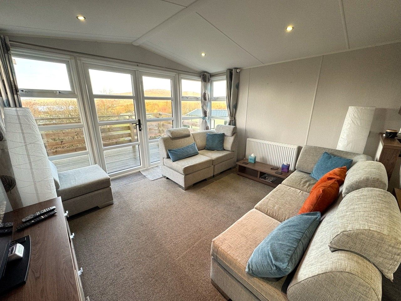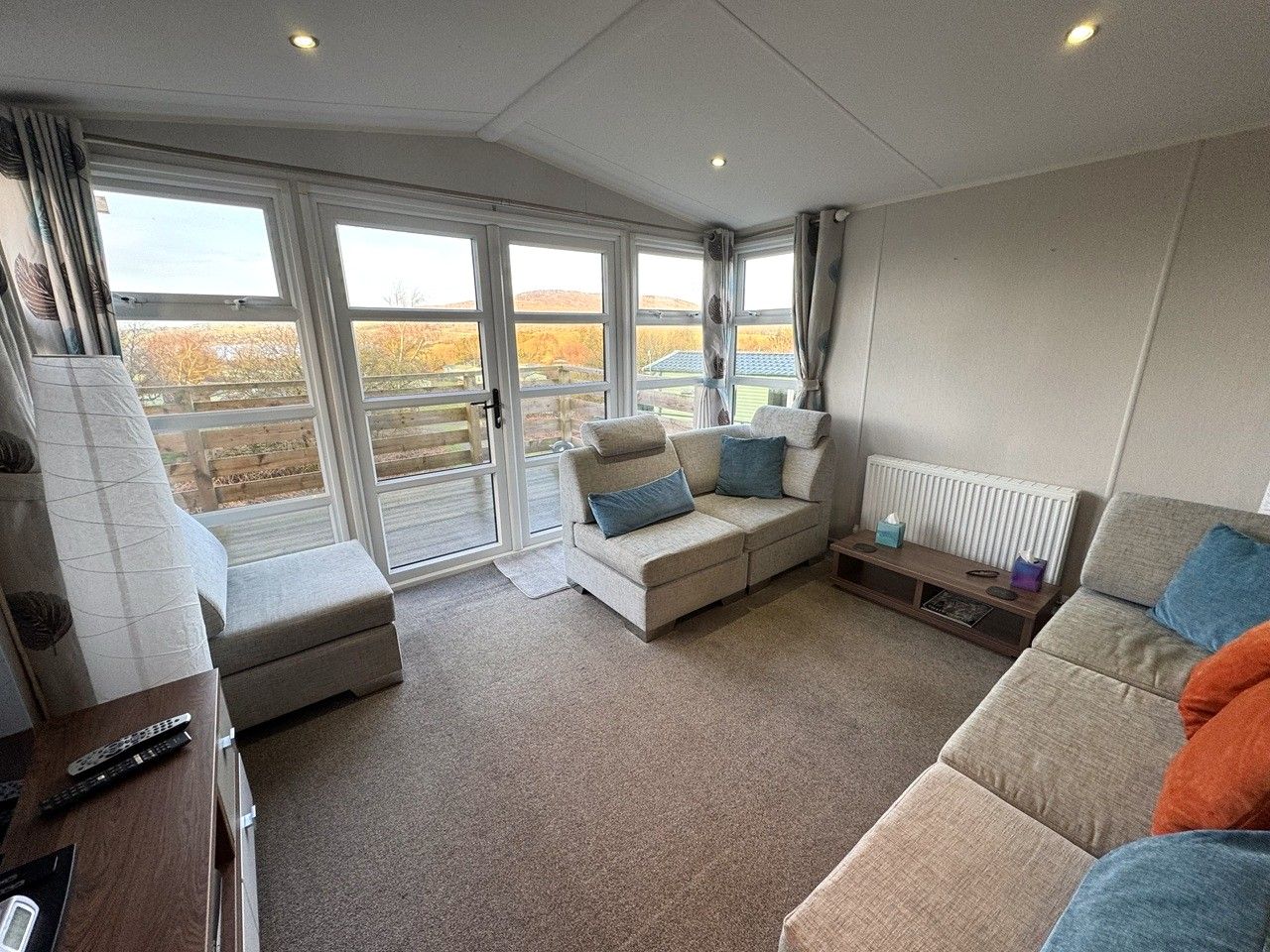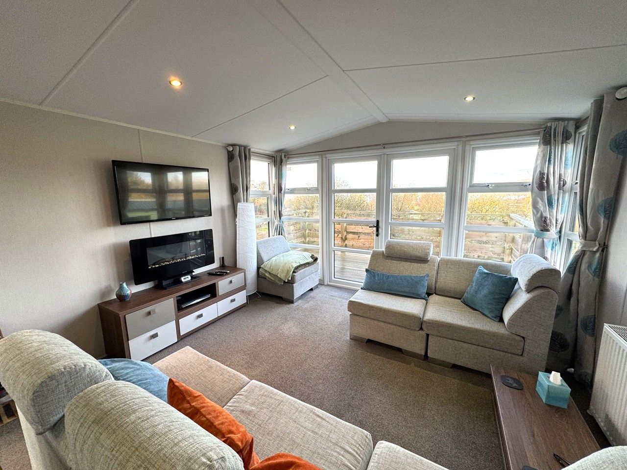 This caravan is sited and sold on Pitch 172, an elevated pitch giving sought-after views. This caravan includes the existing timber-built extended deck, existing TV satellite dish, existing gas bottles, and lounge TV.