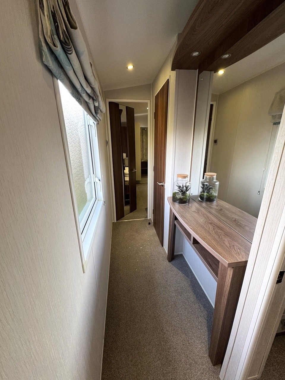 This pre-owned Willerby Skyline boasts stunning panoramic front windows, creating a striking exterior and flooding the spacious lounge with light. This holiday caravan is the ideal sanctuary to escape from the hustle and bustle of ordinary life, enjoy holidays, and make endless special memories at Sandgreen Caravan Park.