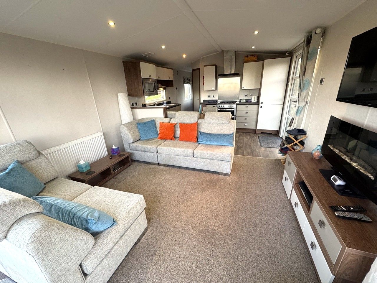 The lounge is a spacious, light and bright room with a large modular sofa (meaning you can make the lounge your own!), coffee table, and a sleek curved glass electric fire with storage below; the ideal place to kick back and relax after a day of fun on the beach. The open-plan layout of this holiday caravan seamlessly leads from the lounge to the kitchen and dining area.