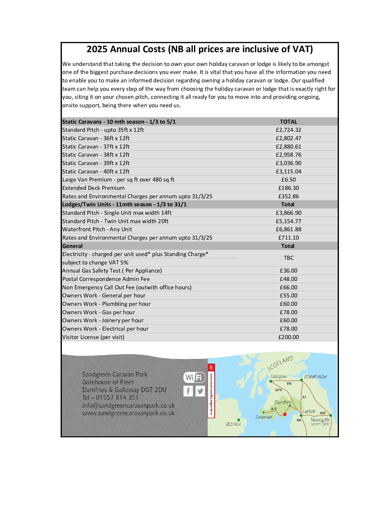 You can download our annual running costs below to assist you with your budgeting. Please feel free to get in touch if you would like any further information or, even better, jump in the car and come and see for yourself what a special place Sandgreen is!